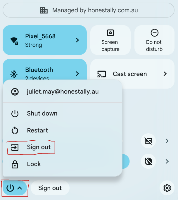 Simply click on the time on the bottom right corner of your screen, then navigate to the power button on the pop-up and click 'Sign Out'.