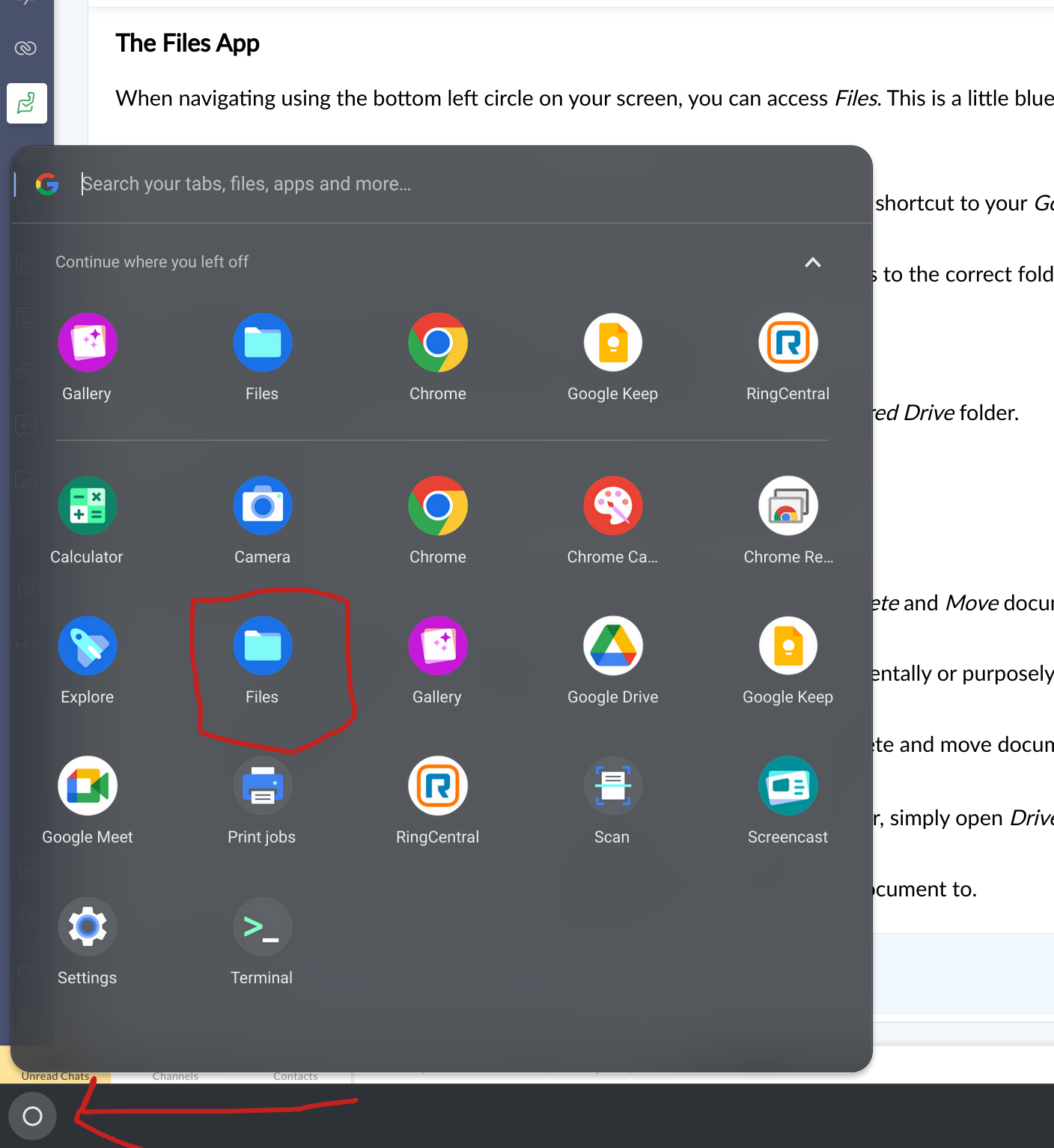 When navigating using the bottom left circle on your screen, you can access Files. This is a little blue folder that syncs with Drive and Docs and also gives you access to your personal My Drive.