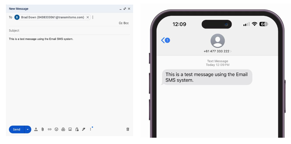 - Set the To: field to the mobile number you're sending to in the following format eg. 04XXXXXXXX@transmitsms.com OR 614XXXXXXXX@transmitsms.com