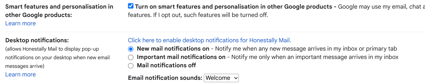 - Scroll down to the Desktop notifications section and click on Click here to enable desktop notifications for your Gmail account.